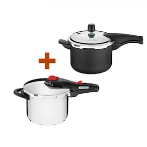 Componentes do KIT: 1 - Panela com Fundo Triplo em Aço Inox 22 cm 6 L - Solar - Tramontina 1 - Panela Pressão 4,5 Lts antiaderente Tramontina Vancouver Panela 6L Solar Cód. 62516223 - Mais praticidade e qualidade na sua cozinha - Produzida em aço inox - Pode ser utilizada em fogão a gás, elétrico, vitrocerâmico ou por indução - Cabo e alça antitérmicos - Fundo triplo: aço inox, alumínio, aço inox - Distribuição de calor uniforme, cozimento rápido e economia de energia - Alimentos aquecidos por mais tempo - Sistema de descompressão - Medidor de capacidade interno - 5 dispositivos de segurança - Capacidade mínima: 250ml de líquido 1/4 litro - Capacidade máxima: 2/3 da capacidade total da panela alimento + líquido - Atestada pela Norma Nacional de Segurança/INMETRO - Acompanha manual de instruções Capacidade da panela: 6 litros Pressão de trabalho: 80/95 kPa Peso líquido: 3,06 kg Peso bruto: 3,85 kg Medidas do produto: 23,1cm A x 24,7cm L x 45cm P Diâmetro da panela: 22cm Medidas da embalagem: 25,4cm A x 27,2cm L x 44,1cm P de 2 anos contra defeito de fabricação. Panela Pressão 4,5L Vancouver - NÃO indicado para fogão Indução. Característica e Descrição Ficha Técnica: - Modelo Vancouver Starflon Cód.20582/620 Grafite Cód.20582/720 Vermelha - Eficiente e Segura. - Produzida em alumínio com revestimento interno e externo em antiaderente Starflon T1 - Tampa em alumínio com acabamento externo polido e interno satinado tampa não é antiaderente . - Alças e cabo superior e inferior em baquelite. - Sitema de segurança lateral - Válvula de segurança - Válvula de trabalho alívio - Revestimento antiaderente StarFlon - Maior resistência á desgaste por fricção, raspagem - Pode cozinhar fogão gás, elétrico e também vitrocerâmico - Fácil manuseio e limpeza - Capacidade 4,5L - 1 Unidade por embalagem - 3 sistema de segurança 1 cabo e 2 na tampa - Medidas internas panela : 19,5cm diâmetro x 14,5 Alt. verifique o nível máxima informado no interior panela - Medida Externa: 22,9cm A x 40,8cm L x 23,1 P - mais detalhes, na foto do anuncio . - Medida Embalagem: 21 cm Alt x 39cm L x 23cm P. Medidas totais do kit: 47cm A x 45cm C x 28cm P Peso total do kit: 5,85 kg