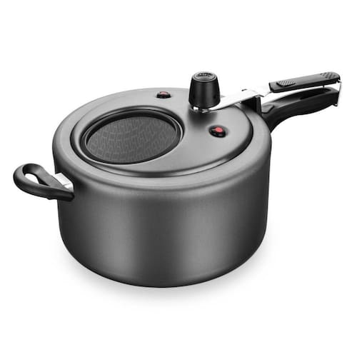Composição e Design: - A panela de pressão possui corpo e tampa em alumínio revestido com 7 camadas de antiaderente, garantindo um aquecimento uniforme e evitando que os alimentos grudem. - As alças e cabos são feitos em baquelite antitérmico, permitindo que você manuseie a panela com facilidade, mesmo quando ela está quente. - A panela possui guarnições em silicone, adicionando uma camada extra de segurança. - O visor em vidro temperado na tampa permite que você acompanhe o progresso de cozimento sem precisar abrir a panela, mantendo o calor e o sabor dentro.