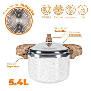 Panela Antiaderente Vanilla Brinox 5,4L Indução Ceramiclife Pressure 4953/103 Panela 5,4L Ceramiclife - Brinox A panela Ceramiclife conta com estrutura de alumínio com revestimento cerâmico que cozinha os alimentos por igual e mais rápido, dissipando melhor o calor, proporcionando um maior aproveitamento de nutrientes dos alimentos agora com exclusivo fundo de indução, que funciona em todos os tipos de fogões, para você passar menos tempo cozinhando e ter mais segurança durante os preparos. Além disso, suas paredes externas possuem pintura na cor Vanilla trazendo mais sofisticação para a sua cozinha. Seu cabo e alça de baquelite com revestimento soft touch em tons amadeirados proporcionam mais conforto e melhor manuseio, já que possuem toque macio e não esquentam. possui 2 anos de e 4 dispositivos de segurança uma trava, duas válvulas de trabalho e um escape de segurança . Medidas aproximadas: Capacidade: 5,4L Diâmetro: 22cm Altura: 15 cm Peso: 1,88Kg Orientações: Ao utilizar utensílios quentes tenha cuidado redobrado. Se necessário, utilize proteção para as mãos e mantenha fora do alcance de crianças. Para sua segurança, ao utilizar utensílios com cabos, mantenha os mesmos sempre voltados para o centro do fogão. Ao utilizar seu utensílio em fogões com grade, mantenha a peça centralizada e alinhe o cabo com a grade, para reduzir o risco de queda. Para descarte do produto e embalagem siga as orientações de reciclagem vigentes. Características: Marca: Brinox Referência: 4953/103 Material: Corpo de alumínio, Revestimento interno e externo de antiaderente Ceramiclife, Alças e cabos de baquelite com revestimento softtouch. Quantidade: 1 peça Cor: Vanilla Imagens Ilustrativas. Marca: Não Informado