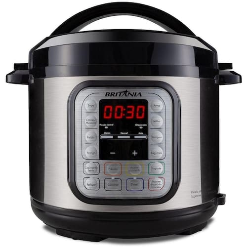 Panela Britânia Revestimento Gold BPP02G 900W Aço inox 220v Cozinhe com maior praticidade e sabor com a Panela Britânia Revestimento Gold BPP02G 900W Ela traz 11 programas de cozimento pré-definidos. Basta colocar o alimento dentro, selecionar a opção, e pronto Você também tem a opção de programar o cozimento automático com até 24 horas de antecedência. Muito mais praticidade dentro da cozinha, simples assim. Mais praticidade para cozinhar o feijão que a família toda gosta. Prepare refeições tamanho família Graças a sua incrível capacidade de 5L . Maior durabilidade e poder de antiaderente com revestimento Revestimento Gold. Preparos e limpeza muito mais fáceis. Sirva os alimentos quentes e saborosos quando você quiser, isso porque a função Manter Aquecido mantém a temperatura por muito mais tempo. Além de trazer a função Manter Aquecido, que permite servir os alimentos aquecidos por muito mais tempo. E não se preocupe, os alimentos não irão grudar graças ao seu revestimento antiaderente Dura Mais. Possibilitando uma limpeza muito mais fácil. E para evitar qualquer acidente, a Panela Britânia Multifuncional Digital BPP2PI conta com 9 sistemas de segurança, para que você cozinhe de forma muito mais tranquila e segura Prepara diversos tipos de alimentos, feijão carnes, arroz, canjica, legumes entre outros, Painel com controle digital e fácil acesso as funções; Visor digital para acompanhamento da programação e dos preparos; Possui 11 modos de cozimento pré-programado, permite iniciar o cozimento com apenas um toque; Modos de cozimento pré-programados: Sopa, Carnes/Músculo, Feijão, Frango, Arroz, Milho, Pudim, Legumes, Iogurte, Cozimento Lento, Refogar. Função manter aquecido, mantém os alimentos aquecidos após o preparo. Pode ser Utilizado para aquecer os alimentos a uma temperatura aproximada de 70C; Função refogar, para dourar temperos e outros alimentos antes de cozinhar na pressão; Função cozinhar, permite programar o tempo de cozimento manualmente Função Pressão permite ajustar o nível para o cozimento, nível normal e alta pressão Função cozimento lento, permite cozinhar alimentos em temperaturas mais baixas por até 12horas Timer programável, permite programar o preparo dos alimentos com até 24 hora de antecedência; Tigela removível com capacidade de 5L, possui revestimento interno antiaderente, fácil de usar e limpar. A tigela possui escalas para preparar até 10 xícaras de arroz cru; Acompanha colher e copo dosador; Suporte para apoiar a colher no produto; Possui 9 sistemas de segurança; Tampa com trava de segurança; Válvula de controle de vapor removível, Alças laterais, facilidade para transportar o produto; Silenciosa, não libera vapor durante o cozimento dos alimentos; Alças laterais com encaixes para apoiar a tampa; Cordão elétrico removível, permite levar a panela à mesa com facilidade; Pés antiderrapantes; Acabamento em inox; Composição: metal, plástico e tigela em alumínio; enquanto durarem os estoques. Especificações Altura31,50cm Largura34,30cm Profundidade30,50cm Peso4,37kg Características Dias 360 Corprata Estadonovo Detalhes do funcionamentoDetalhes do funcionamento Capacidade L 5 Modelo- Alçasim Marcabritânia Função manter aquecidoSim Potência900
