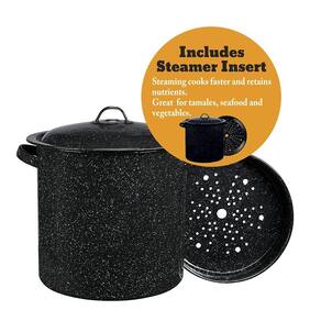 Bring heritage-inspired cooking to your kitchen with the Granite Ware 15.5 Qt Steamer Pot with Rack in classic black. Designed to blend strength and performance, this steamer pot features a steel core that is fused with porcelain to form a naturally nonstick, glass-like surface. The result? Even heat distribution, reliable steaming power, and a non-reactive finish that locks in the autêntico flavor, color, and nutrients of your food. Free from PFOA, PTFE, and other harmful chemicals, this porcelain-coated cookware offers peace of mind while delivering wholesome, delicious meals. Its 15.5-quart capacity and included rack make it easy to cook tamales, steam shellfish, or prepare healthy vegetables in generous portions. Whether you’re preparing a holiday feast or reviving traditional family recipes, this steam pot for cooking makes it easier to serve up hearty, nourishing food without compromise. Sturdy, functional, and versatile, this stock pot brings authenticity and practicality to your kitchen essentials lineup—no matter what’s on the menu.