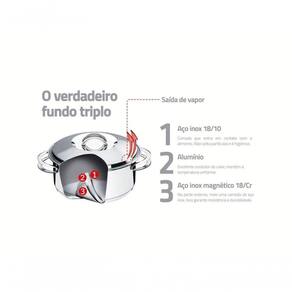 - O fundo triplo (aço inox + alumínio + aço inox) das panelas distribui o calor uniformemente, proporcionando um cozimento mais rápido e uniforme, economizando energia, deixando os alimentos macios, saborosos e aquecidos por mais tempo.- Totalmente feitas em aço inox, não soltam nenhum resíduo nos alimentos, mantendo-os saudáveis.- A tampa possui dois furos para saída de vapor, não permitindo a formação de vácuo.- As panelas podem ser utilizadas nos seguintes fogões: por indução, gás, elétrico e vitrocerâmico.- seu desenho limpo e sem cantos Torna a limpeza muito mais fácil.