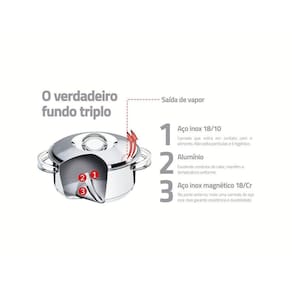 Fundo triplo (aço inox + alumínio + aço inox) para distribuição uniforme do calor.