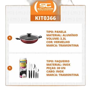 Componentes do kit: -1 panela wok alumínio 28cm loreto vermelho -1 faqueiro 30pç - tramontina Panela 28cm wok loreto alumínio antiaderente tramontina 27817/022 - não indicado para fogão indução. Descrição ficha técnica: Produzida em alumínio com revestimento interno antiaderente starflon t1 Tampa em vidro temperado com saída de vapor e borda de aço inox. Alças de baquelite e pegador de nylon. - modelo wok loreto 28cm. - corpo em alumínio reforçado 1,8mm. - revestimento antiaderente starflon. - maior resistência a desgaste por fricção, raspagem. - pode cozinhar fogão a gás, elétrico e também vitrocerâmico. - fácil manuseio e limpeza. - capacidade 3,3 l. - 1 unidade por embalagem. - pode lavar em máquina. Peso líquido: 1,3 kg Peso bruto: 1,45 kg Medida externa: 13cm a x 40,9cm l 29,4cm área cuba . - mais detalhes, na foto do anuncio . Faqueiro facas talheres ipanema 30pç tramontina 23398/088 Faca e garfo. Descrição ficha técnica: Modelo ipanema 30 peças. Cód. 23398/088 cor preta. Uso seguro e adequado: - antes da primeira utilização, lave bem as peças e seque-as. - produtos cortantes e perfurantes, tenha cuidado e mantenha sempre fora de alcance das crianças. - para maior durabilidade dos produtos, recomenda-se secar bem antes de guardar, mesmo após lavagem em máquinas. - para descarte dos produtos e embalagem, siga a orientação de reciclagem vigente. Conteúdo: 6 facas lâmina 11,2cm - medida 21cm 6 garfos de mesa. - medida 19cm 6 colheres de mesa. - medida 19cm 6 garfos para sobremesa. - medida 14cm 6 colheres para chá. - medida 14cm - lâmina em aço inox, maior resistência a desgaste por fricção, raspagem. - fácil manuseio e limpeza sempre cuidando com navalha e pontas . - 30 pç por embalagem. Peso líquido: 0,95 kg Peso bruto: 1,05 kg Especificação da embalagem do kit: Peso bruto: 2,5kg Medida embalagem: 19cm alt x 30cm l x 36cm p. Perguntas frequentes: - Sim, , lacrado e de fábrica. - tem - qual a é de 12 meses contra defeito de fabricação. - qual a capacidade da panela 3,3 l - diâmetro de 28cm.