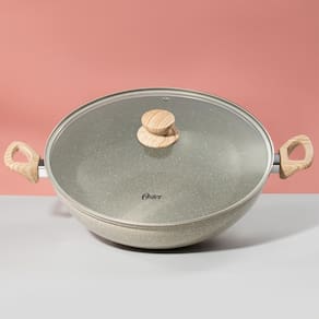 Versatilidade na cozinha: a frigideira wok de cor marmorizada cinza dust, oferecendo versatilidade para suas necessidades culinárias.