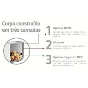 - Possui tecnologia de corpo triplo (aço inox + alumínio + aço inox) que distribui uniformemente o calor, proporcionando um cozimento mais rápido e deixando os alimentos aquecidos por mais tempo, além de economizar energia.