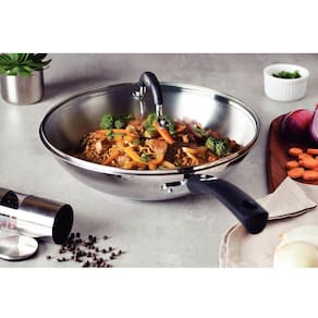 - Para preparar suas receitas com muito mais qualidade e estilo, conte com a Wok Tramontina Solar Silicone em aço inox com fundo triplo e a tampa de vidro 28 centímetros de diâmetro.
