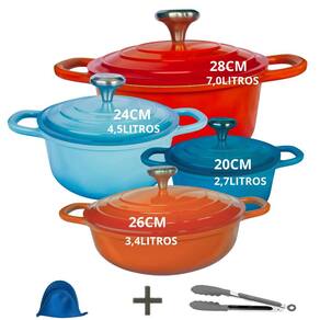 01un Panela com 20cm de diametro e 2,7litros01un Panela com 24cm de diametro e 4,5litros01un Panela com 26cm de diametro e 3,4litros01un Panela com 28cm de diametro e 7,0litros02un Luva de silicone01un Pegador Universal Estas Panelas são aptas para fogões de indução, a gás, eletrico ,vitrocerâmico .Estas Panelas são diferentes de tudo que voce ja viu, indispensáveis,não solta residuos nada gruda mesmo sem oleo ,é livre de PFOA, mantem o alimento quente por muito tempo e são leves de manusear podendo ser levadas do fogão à mesa de servir.