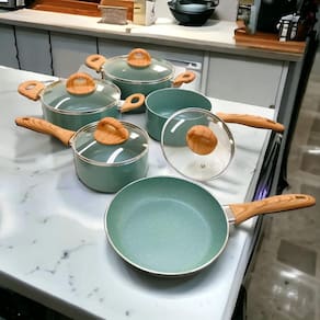 Panelas De Indução CeramicLife Botanika 5 Peças - Brinox O conjunto de Panelas 5 peças botanica, Com exclusivo fundo de indução, que pode ser em qualquer tipo de fogão, ele ainda conta com a nova geração de antiaderente: o Mineral resist compartículas de cerâmica, a frigideira do conjunto está mais resistente ao uso em altas temperaturas, enquanto as demais peças continuam entregando a mesma qualidade de sempre, livres de metais pesados e elementos químicos prejudiciais à saúde, exigindo menos uso de óleo no preparo das refeições, além de não deixar os alimentos grudarem, facilitando a limpeza e consumindo menos energia com o antiaderente pro ceramic premium. Especificação: Cor: verde/natu Material: revestimento cerâmico Quantidade de peças: 5 Tipos de fogão: gás, vitrocerâmico e elétrico Frigideira: 22cm x 4,5cm - 1,1 L Caçarola: 22cm x 10,5cm - 3,55 L Panela com tampa: 18cm x 9 cm - 1,55L Panela com tampa: 16cm x 8cm - 1,25 L Caçarola: 20cm x 9,5cm - 2,55 L Marca: Não Informado