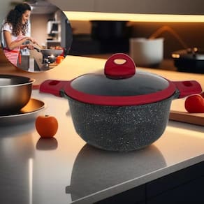 Revestimento antiaderente premium: facilita o preparo dos alimentos, evitando que grudem e permitindo uma limpeza rápida e prática. Compatibilidade com indução: cozinhe de forma eficiente com distribuição uniforme do calor. Design moderno cor preta e vermelha. Tampas de vidro temperado: com saída de vapor para preservar o sabor e os nutrientes. Cabos ergonômicos e seguros: oferecem conforto e segurança durante o manuseio. Resistência e durabilidade: fabricado com materiais de alta qualidade, resistente a riscos e abrasões.