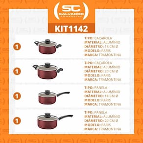 Componentes do Kit: - 1 Caçarola 18 cm 2,1 L Paris - 1 Caçarola 20 cm 2,9 L Paris - 1 Panela 18 cm 2,1 L Paris - 1 Panela 20 cm 2,9 L Paris Jogo de Panelas Paris 4 Peças Alumínio Antiaderente Vermelho Patv - Tramontina - Corpo de alumínio com espessura que proporciona cozimento rápido e uniforme. - Revestimento interno e externo de antiaderente Starflon Max que não gruda, é fácil de limpar, mais durável e Não é prejudicial à saúde, pois é livre de PFOA. - Tampas de vidro temperado, com saída de vapor e bordas de aço inox. - Cabos, alças de baquelite antitérmico e pegadores de nylon que oferecem segurança durante o manuseio. - Podem ir à máquina de lavar louças facilitando seu dia a dia. Para preparar suas refeições do dia a dia, é indispensável que você conte com um item que lhe garanta Praticidade e versatilidade, como a panela Tramontina Paris em alumínio com revestimento interno e externo em Antiaderente Starflon Max vermelho. Produzida em alumínio com revestimento interno e externo em antiaderente Starflon Max, ela garante o cozimento rápido e uniforme dos alimentos, evita que eles grudem em sua superfície E proporciona uma limpeza muito mais fácil. Ela possui tampa de vidro temperado com saída de vapor e borda de Aço inox, que facilita a visualização dos alimentos e facilita seu preparo. Seu cabo ou alças são em baquelite Antitérmico e o pegador da sua tampa é em nylon, dois materiais antitérmicos que proporcionam um manuseio muito Mais seguro e confortável, pois não esquentam. Uma panela que pode ser levada à máquina de lavar louças e que Vai otimizar sua rotina na cozinha : 90 dias para vícios ou defeitos de fabricação. Mais informações: - Tipo: Conjunto de panelas - Cor: Vermelho - Linha: Paris - Revestimento: Antiaderente Starflon Max - Fogão: Gás, Elétrico, Vitrocerâmico - resistência elétrica - Máquina de lavar: Sim Marca: Não Informado