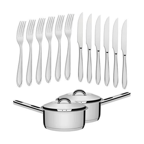 Muito importante: -- conferir produtos no ato do recebimento. Não aceitar produtos com embalagem violada amassado, rasgado, aberto, quebrado, etc , a recusa deve ser feita no ato. Conjunto de panelas solar 16cm 1,4l com 48 talheres de mesa laguna tramontina Componentes do kit: 24 un - 63906180 faca para churrasco laguna em aço inox - tramontina 24 un - 63906020 garfo de mesa laguna em aço inox - tramontina 2 un - 62501160 panela em aço inox linha solar fundo triplo 16 cm 1,4l pit7 - tramontina --- faca para churrasco laguna em aço inox - tramontina 63906180 : 90 dias para vícios ou defeitos de fabricação - ideal para restaurante, lancheria, paderia, linha doméstica, residência, gourmet - acabamento em brilho, com detalhes no cabo - própria para uso diário combina com qualquer ambiente - pode ser lavada diariamente na máquina de lavar louças - peso líquido: 0,043 kg - peso bruto: 0,045 kg - dimensões embalagem : 0,8cm a x 2cm l x 23cm p - dimensões produto : 0,3cm a x 1,8cm l x 21cm p - espessura: 3,0 mm --- garfo de mesa laguna em aço inox - tramontina 63906020 : 90 dias para vícios ou defeitos de fabricação - ideal para restaurante, lancheria, paderia, linha doméstica, residência, gourmet - próprio para uso diário combina com qualquer ambiente - pode ser lavado diariamente na máquina de lavar louças - peso líquido: 0,032 kg - peso bruto: 0,035 kg - dimensões embalagem: 2cm a x 2,5cm l x 20cm p - dimensões produto : 1,9cm a x 2,3cm l x 19,3cm p - espessura: 1,6 mm --- panela em aço inox linha solar fundo triplo 16 cm 1,4l pit7 tramontina 62501160 : 90 dias para vícios ou defeitos de fabricação - pode ir ao forno em temperatura máxima de 260c, podendo haver mudança na coloração. - produto com certificação compulsória certificada pela ocp 0104- pcn do brasil, registro 001470/2018, conforme portaria inmetro 419/2012. Especificações técnicas: - altura sem tampa: 8cm - altura com tampa: 11cm - diâmetro externo: 18cm - diâmetro interno: 16cm - altura interna: 7cm - largura total: 33cm