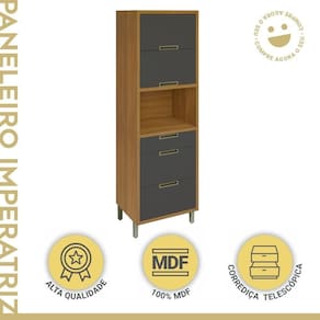 Paneleiro 2 Portas 3 Gavetas Imperatriz Nesher Móveis Freijó/grafite O Paneleiro Nesher Imperatriz tem design contemporâneo, robusto e é muito prático. Inspirada em cozinhas planejadas, está disponível em módulos, permitindo composições variadas, projetos exclusivos, conforme o espaço e o gosto do consumidor. Disponível em duas cores de porta, off-white e grafite, como o corpo sempre amadeirado freijó. Projetada para proporcionar praticidade e funcionalidade no uso diário, produzida com matérias prima de e ferragens tecnológicas de última geração. Todo o projeto foi pensado para embelezar seu Paneleiro com muita praticidade no uso e muita qualidade e durabilidade no dia a dia. Diferenciais únicos: - Modernas portas com abertura basculante e pistão a gás. - Puxadores em perfil de Alumínio Anodizado na cor champanhe, moderno, com qualidade e durabilidade. - Gavetas com corrediça telescópica abertura integral e organizador de talheres. - Ergonômicos gavetões com laterais e traseiros altos para armazenagem com de utensílios e mantimentos. - prático gaveta porta temperos e gaveta com organizador de talheres. Medidas Altura: 221cm Largura: 70cm Profundidade: 52cm