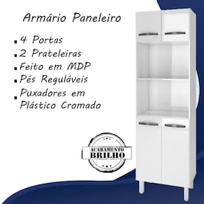 O Paneleiro 4 Portas Mara, possui um amplo espaço interno excelente para armazenar seu utensílios de cozinha e mantê-la sempre organizada. Estrutura toda feita em MDP de 12 e 15mm, com puxadores em plástico cromado e dobradiças metálicas, acompanham pés fixos de 16,5cm que garantem a firmeza que o móvel precisa, com regulagem de altura até 18 cm somente para nivelamento. Este lindo móvel irá deixar seu ambiente ainda mais charmoso e elegante. Perfeito para você que deseja guardar micro-ondas e forno e deixar o ambiente mais harmonizado. Este móvel chegará em sua casa separado em 01 volume.