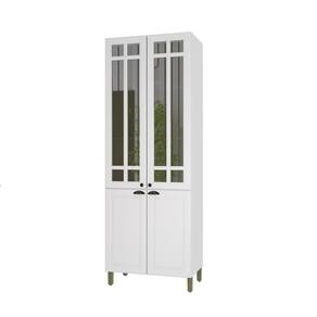 Paneleiro Firenze com design retrô moderno, profundidade de 52cm que acompanha os balcões, oferecendo mais espaço para utensílios maiores. Conta com 4 portas, sendo 2 com vidro reflecta espelhado de 3mm, dobradiças com amortecedor e puxadores em metal na cor bronze. Possui 4 prateleiras internas, pés com regulagem e estrutura em MDP 15mm, com portas em MDF 15mm e pintura UV. Acabamento refinado com pintura PU nas bordas e usinagem decorativa na frente das portas.