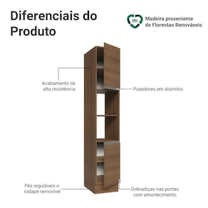 As portas possuem dobradiças com amortecimento, que proporcionam fechamento suave e silencioso. Os pés possuem regulagem de altura e o rodapé removível facilita a limpeza.