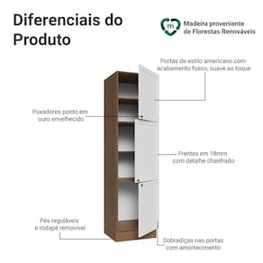 O acabamento fosco de alta resistência da estrutura é em amadeirado Rustic e das portas em Branco, refletindo o estilo americano com um toque moderno. Possui uma textura suave ao toque, trazendo leveza e sofisticação ao ambiente. O destaque vai para os puxadores ponto em ouro envelhecido, feitos com metal resistente, que adicionam personalidade e um charme único.