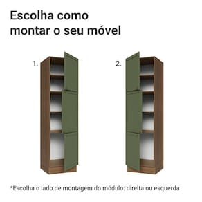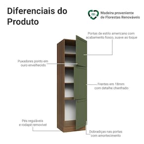 O acabamento fosco de alta resistência da estrutura é em amadeirado Rustic e das portas em Verde, refletindo o estilo americano com um toque moderno. Possui uma textura suave ao toque, trazendo leveza e sofisticação ao ambiente. O destaque vai para os puxadores ponto em ouro envelhecido, feitos com metal resistente, que adicionam personalidade e um charme único.