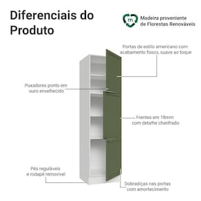 O acabamento fosco de alta resistência da estrutura é em Branco e das portas em Verde, refletindo o estilo americano com um toque moderno. Possui uma textura suave ao toque, trazendo leveza e sofisticação ao ambiente. O destaque vai para os puxadores ponto em ouro envelhecido, feitos com metal resistente, que adicionam personalidade e um charme único.