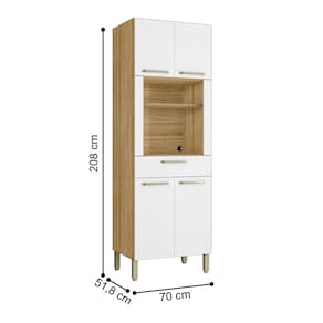 Produzido em MDP de 15 mm., madeira reconstituída provinda de reservas manejadas para este fim, é um produto ecologicamente correto. Nas quatro portas e na ampla gaveta são utilizadas dobradiças 100% metálicas e corrediças telescópicas que garantem facilidade e segurança no abrir e fechar das portas e gavetas. Dispõe de amplo espaço interno para melhor organizar os objetos da cozinha, além de um nicho para microondas e prateleira para pequenos objetos ou decoração acima do microondas. Os puxadores são ergônomicos em plástico resistente. Em sua base utiliza pés reguláveis em plástico resistente que propicia perfeita montagem mesmo em pisos com pequenos desníveis. Um produto que certamente irá ajudar na organização de sua cozinha, aproveitando muito bem os espaços.