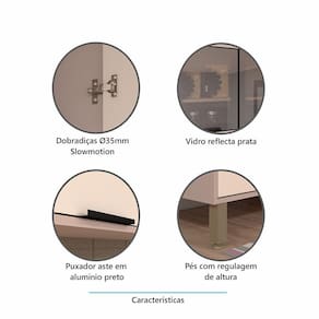 Características Estrutura: MDP 15mm Acabamento da Caixaria/Corpo: PF Acabamento das Portas/Frontal: BP Quantidade de Portas: 4 de Abrir Tipo de Vidro: Vidro Reflecta Prata Tipo de Dobradiças: Metálicas 35mm Slow Motion Quantidade e Tipo de Puxadores: 4 Puxador em Alumínio Preto Quantidade de Prateleiras: 4 Sistema de Montagem: Cavilhas e parafusos. Garantia do Fabricante: 3 meses Itens inclusos: Paneleiro, manual de montagem, ferragens e acessórios.