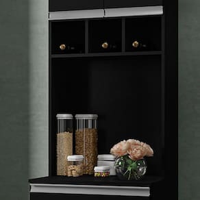 paneleiro conta com ótima repartição interna, nichos garrafeiros e espaço sobre o tampo para você dispor eletros, itens decorativos ou o que mais você precisar que fique sempre fácil de encontrar. Ah, já a gaveta pode servir de armazenamento para talheres ou panos de pratos. Em outras palavras, mais armazenamento e mais organização na