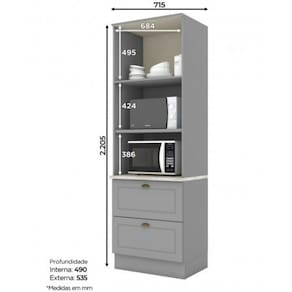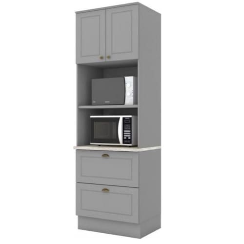Composto por 2 portas de bater com dobradicas metalicas, gavetas com corredicas telescopicas, prateleira interna, espacos para forno ou microondas, puxadores em metal, este armario e um modulo avulso da composicao Cozinha Modulada Americana e e ideal para compor sua cozinha como desejar.