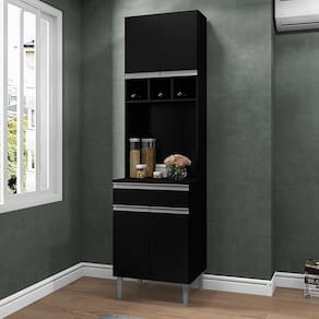 O Paneleiro Duplo Andréia, versátil para uso isolado ou como complemento a Cozinha Modulada Andréia, é a escolha ideal para quem busca qualidade e sofisticação ao planejar sua cozinha. Sua estrutura é fabricada em MDP, com um acabamento em pintura UV. O móvel é composto por quatro portas equipadas com dobradiças metálicas, um tampo com espaço destinado para micro-ondas ou outros aparelhos domésticos, uma gaveta com corrediças telescópicas, três nichos para garrafas, prateleira interna para utensílios de cozinha, puxadores em alumínio e pés reguláveis.