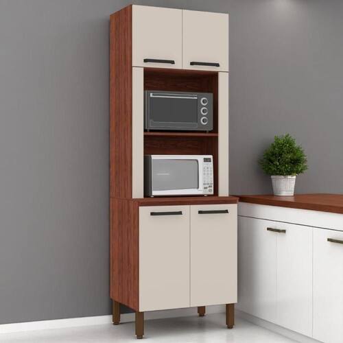 Produzido em MDP de 15 mm., madeira reconstituída provinda de reservas manejadas para este fim, é um produto ecologicamente correto. Nas quatro portas são utilizadas dobradiças 100% metálicas que garantem facilidade e segurança no abrir e fechar das portas. Dispõe de amplo espaço interno para melhor organizar os objetos da cozinha, além de um micho para microondas e forno elétrico. Os puxadores são ergônomicos em plástico resistente. Em sua base utiliza pés reguláveis em plástico resistente que propicia perfeita montagem mesmo em pisos com pequenos desníveis.