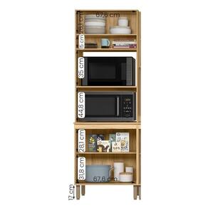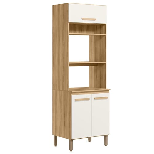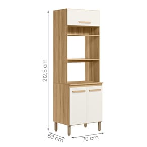 Modelo: Paneleiro Torre Quente; Altura: 212,5 cm; Largura: 70 cm; Profundidade: 53 cm; Material da estrutura: MDP; Quantidade de portas: 03, sendo 1 basculante com pistão; Material de dobradiças: Metálicas; Quantidade de gavetas: Não se aplica; Com puxador: Sim, em MDF; Quantidade prateleiras: 02; Pés com regulagem: Sim; Peso suportado: até 70 kg distribuídos; Requer montagem: Sim (kit montagem incluso);