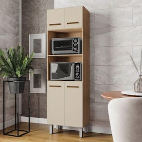 Paneleiro alto com quatro portas e dois nichos centrais para eletrodomésticos exemplo micro-ondas, forno elétrico. Oferece amplo espaço interno para utensílios e mantimentos, pés elevados que facilitam a limpeza e design moderno que otimiza o espaço da cozinha.Dimensões do Paneleiro:Altura: 197 cmLargura: 60 cmProfundidade: 37,8 cmCaracterísticas Técnicas:- Chapa MDP- Caixote 12mm- Portas 15mm- Acabamento em pintura U.V- 04 Portas- Dobradiças metálicas- Puxadores plástico- Pés com regulagem- Altura pé 16 cmDiferenciais do Paneleiro Íris:- Material da Estrutura: fabricado com MDP12/15mm- Detalhes do Íris: Dobradiças Reforçadas; Puxadores Horizontais, finalizados com um excelente acabamento;Recomendações de limpeza:-Limpar com flanela limpa e seca. Não molhar o móvel e não expor em lugar úmido ou próximo de fontes de calor. Não usar produtos abrasivos.