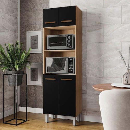 Paneleiro alto com quatro portas e dois nichos centrais para eletrodomésticos exemplo micro-ondas, forno elétrico. Oferece amplo espaço interno para utensílios e mantimentos, pés elevados que facilitam a limpeza e design moderno que otimiza o espaço da cozinha.Dimensões do Paneleiro:Altura: 197 cmLargura: 60 cmProfundidade: 37,8 cmCaracterísticas Técnicas:- Chapa MDP- Caixote 12mm- Portas 15mm- Acabamento em pintura U.V- 04 Portas- Dobradiças metálicas- Puxadores plástico- Pés com regulagem- Altura pé 16 cmDiferenciais do Paneleiro Íris:- Material da Estrutura: fabricado com MDP12/15mm- Detalhes do Íris: Dobradiças Reforçadas; Puxadores Horizontais, finalizados com um excelente acabamento;Recomendações de limpeza:-Limpar com flanela limpa e seca. Não molhar o móvel e não expor em lugar úmido ou próximo de fontes de calor. Não usar produtos abrasivos.