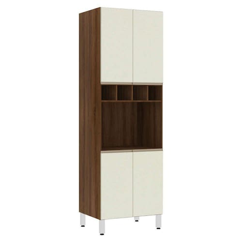 Características : Caixa: MDP - Nogueira Dourado - Acabamentos em F.F. Dobradiças: Ø35mm Slow motion. Puxadores: Alumínio Gola - Inox. Pés: P S - Cromado Prateleiras: 3 Portas: 4 Montagem com Minifix, Parafusos e cavilhas.