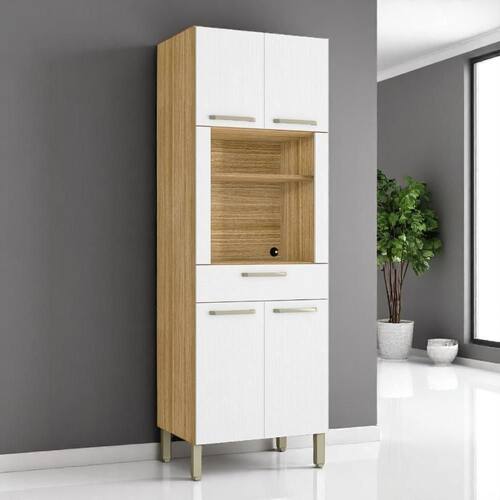 Produzido em MDP de 15 mm., madeira reconstituída provinda de reservas manejadas para este fim, é um produto ecologicamente correto. Nas quatro portas e na ampla gaveta são utilizadas dobradiças 100% metálicas e corrediças telescópicas que garantem facilidade e segurança no abrir e fechar das portas e gavetas. Dispõe de amplo espaço interno para melhor organizar os objetos da cozinha, além de um nicho para microondas e prateleira para pequenos objetos ou decoração acima do microondas. Os puxadores são ergônomicos em plástico resistente. Em sua base utiliza pés reguláveis em plástico resistente que propicia perfeita montagem mesmo em pisos com pequenos desníveis. Um produto que certamente irá ajudar na organização de sua cozinha, aproveitando muito bem os espaços.