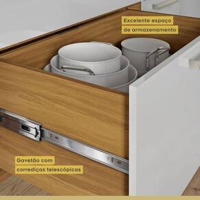 - Corrediça Telescópica Abertura Integral: Robusta e com três estágios, esta corrediça é ideal para o diário, facilitando o acesso aos utensílios.