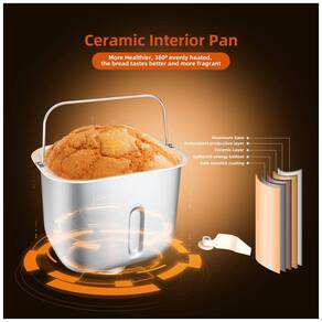 Panificadora automática de aço inoxidável com 19 menus, 3 tamanhos de pão (0,450, 0,680, 0,907kg) e 3 cores de crosta. Possui timer de 15 horas, função Keep Warm automática de 1 hora e recuperação de interrupção de energia de 15 minutos.Acessórios