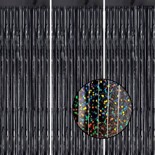 Pacote com 3 panos de fundo com franjas de alumínio DECOCKRAT — Cortinas de enfeites brilhantes pretas a laser para decoração de festas/adereços de cabine fotográfica — pano de fundo de alumínio metálico de 3,3 x 8,2 pés para aniversário, casamento, formatura e Natal.