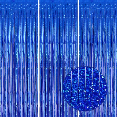 Pacote com 3 panos de fundo com franjas de alumínio DECOCKRAT — Cortinas de enfeites brilhantes a laser em azul royal para decoração de festas/adereços de cabine fotográfica — pano de fundo de alumínio metálico de 3,3 x 8,2 pés para aniversário, casamento, formatura e Natal