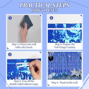 -?Instalação fácil e conveniente?Essas cortinas de alumínio com franjas são fáceis de instalar e podem ser penduradas rapidamente em superfícies lisas usando a fita adesiva dupla face incluída. Não são necessárias ferramentas ou materiais extras.
