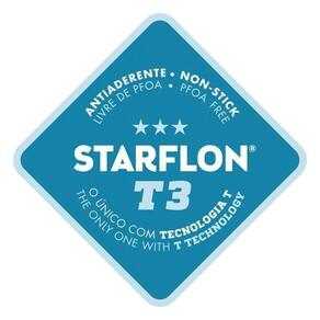 Corpo de alumínio com acabamento externo lixado. Espessura da peça de 2 mm: distribuição uniforme do calor. Revestimento interno de antiaderente Starflon T3. O único com a tecnologia T: maior poder de antiaderência; maior resistência à abrasão; maior durabilidade; mais fácil para limpar e livre de PFOA, garantindo uma resistência à abrasão mais de 15.000 ciclos baseado na Norma ABNT NBR 15321:2013. Cabo de baquelite. Maior resistência antitérmica. Sistema de fixação do cabo com 2 rebites. Estabilidade no manuseio.