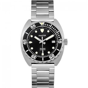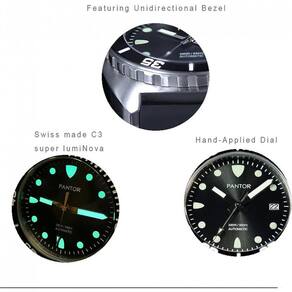 Fabricado nos EUA ou importado Relógios de mergulho profissionais automáticos para homens com válvula automática de hélio às 9h Resistência à água de 300 m , 990 pés com movimento SII NH35A adequado para mergulho, natação e mergulho livre 20 camadas Swiss Super LumiNova em índices, ponteiros e marcação de moldura rotativa unidirecional de 120 cliques Cristal de safira com revestimento anti reflexo, diâmetro 42,, espessura 12,, caixa em aço inoxidável e pulseira com fivela assinada PANTOR Aperte bem a coroa antes de entrar na água