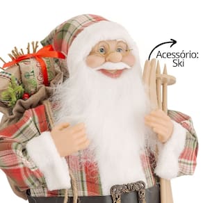 Encante sua decoração natalina com este sofisticado Papai Noel decorativo de 60cm. Vestido com um elegante casaco xadrez vermelho, ele carrega um saco de presentes decorado e um par de skis, simbolizando o espírito aventureiro do Natal. Seu gorrinho xadrez com guizo adiciona um toque festivo e charmoso, perfeito para destacar em qualquer ambiente.