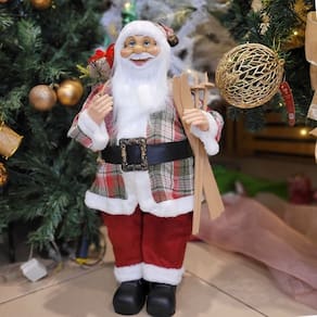 Papai Noel Decorativo de 60cm – Modelo em Pé com Casaco Xadrez Vermelho, Saco de Presentes e Ski