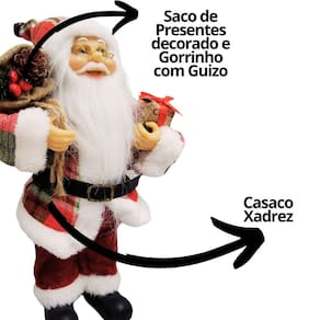 O modelo apresenta casaco xadrez vermelho e verde, gorrinho com guizo e um saco de presentes decorado, que completam o visual festivo do bom velhinho. Ideal para compor mesas, prateleiras, aparadores ou complementar a decoração da árvore de Natal, trazendo alegria e aconchego ao ambiente.