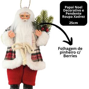 Com 25cm de altura, ele pode ser utilizado tanto em pé sobre superfícies como pendurado na árvore de Natal, guirlandas ou arranjos. Seu visual acolhedor inclui um gorro com guizo dourado e uma charmosa decoração com folha de pinheiro e berries, além de um elegante paletó xadrez vermelho e preto.