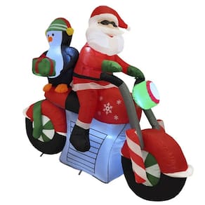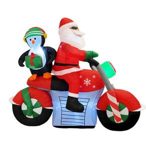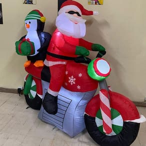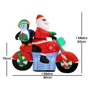 Chegou a hora de dar um toque de diversão e originalidade à sua decoração de Natal! Este Papai Noel Inflável de Moto, acompanhado de seu fiel ajudante, o Pinguim com Presente vai ser a atração principal na sua fachada, jardim, hall de entrada ou loja!