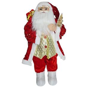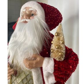 Encante sua decoração natalina com este Papai Noel, repleto de charme e brilho. Vestido com roupa vermelha de veludo repleto com lantejoulas e forro dourado cintilante, ele traz um toque sofisticado e festivo para qualquer ambiente.