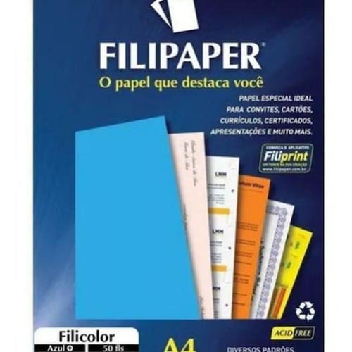 Papel A4 Color Filicolor Azul 180G Pacote Com 50 FilipaperA linha filipaper filicolor é ideal para convites, cartões, impressões e trabalhos para artesanatos.Possui qualidade fotográfica e secagem rápida instantânea.Pacote filipaper filicolor a4 (21 x 29,7 cm) com gramatura de 180g e 50 folhas.