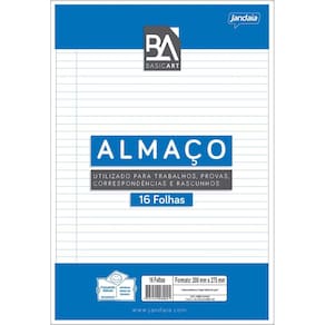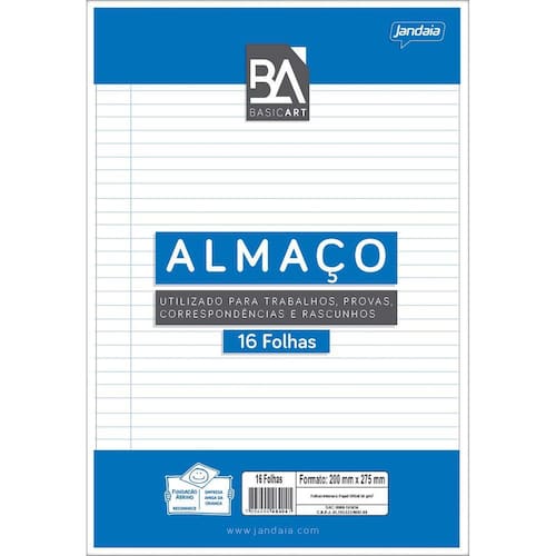 O papel almaço é uma espécie de papel que equivale a duas folhas de caderno sem espiral ou encadernação, unidas e é ideal para o dia a dia na escola, auxiliando na organização de trabalhos e provas. Possui linhas convencionais, a espessura do papel é de 56g/m². O bloco contém 16 folhas no tamanho de 200x275mm