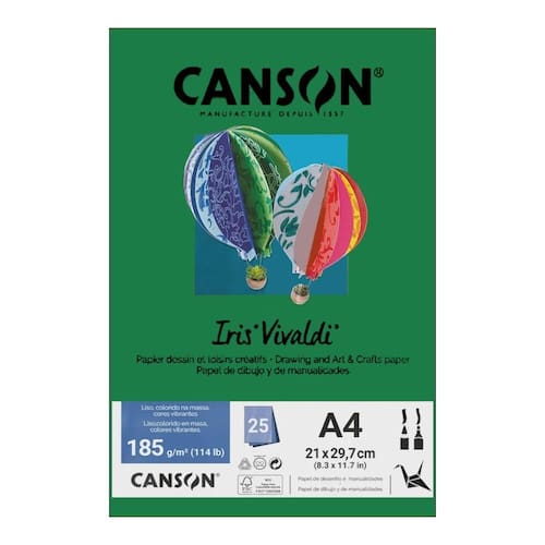 - Marca: Canson - Modelo: Iris Vivaldi - Contém 25 folhas - Cores vibrantes - Textura lisa - Gramatura: 185g/m - Formato: A4 - Dimensões: 21 x 29,7cm Largura x Comprimento - Livre de ácidos Marca: Não Informado